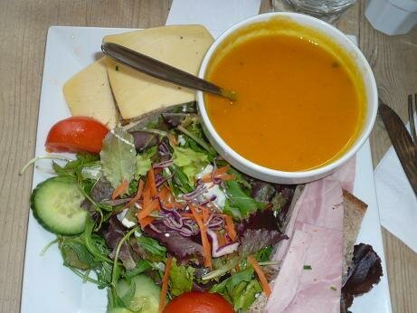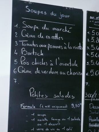 It was such a cute little place. Menu of the day on the chalkboard. 11,80 euros ($17) for soupe de potiron (pumpkin soup), open-face sandwiches of ham and gouda cheese on Poilâne-style bread, and salad.